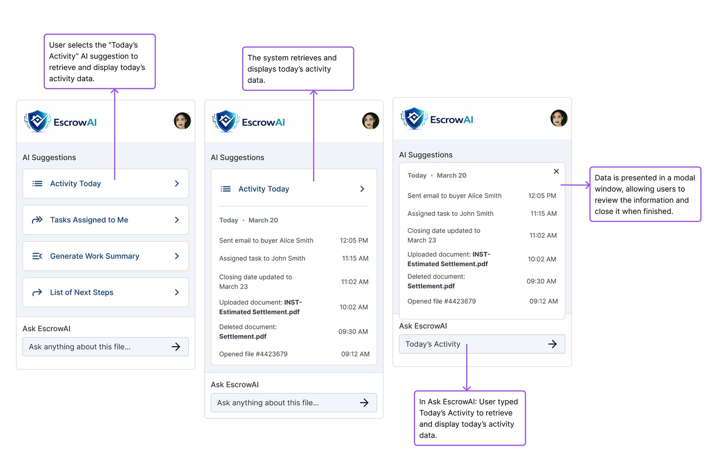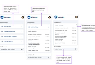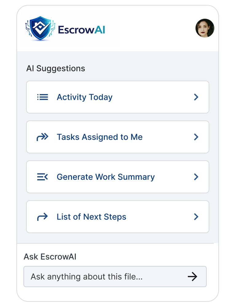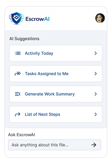 EscrowAI is an intelligent assistant embedded within the escrow file experience, designed to automate activity tracking, surface insights, and reduce manual effort for escrow officers. It transforms fragmented logs and updates into actionable, real-time guidance.