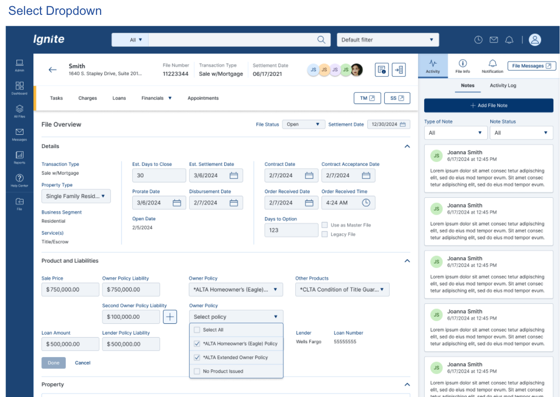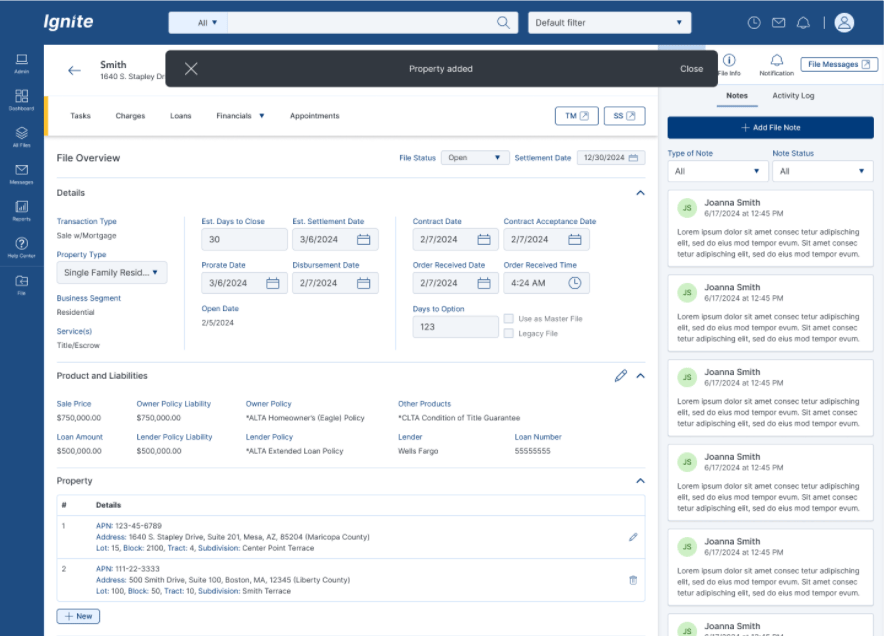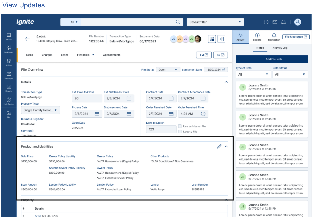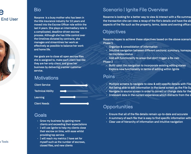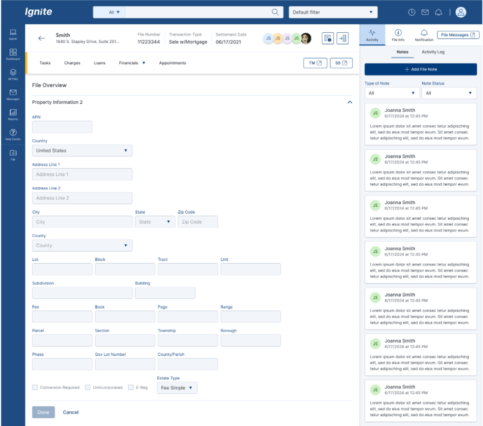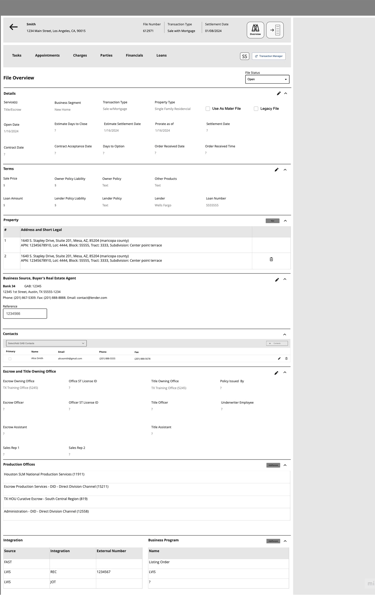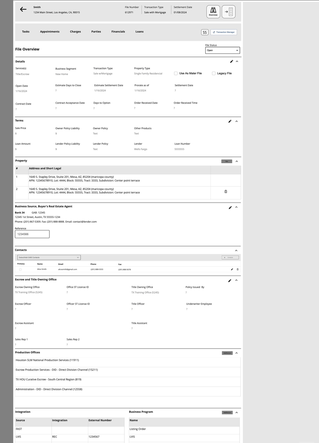 The File Overview screen provides quick access to key file details, enabling escrow officers to manage information efficiently without navigating multiple screens after file creation. It will function as a standalone screen in the Escrow application, consolidating Terms/Dates and Status, Property Tax information, File Summary, and File Homepage from the legacy system into a single, unified view.