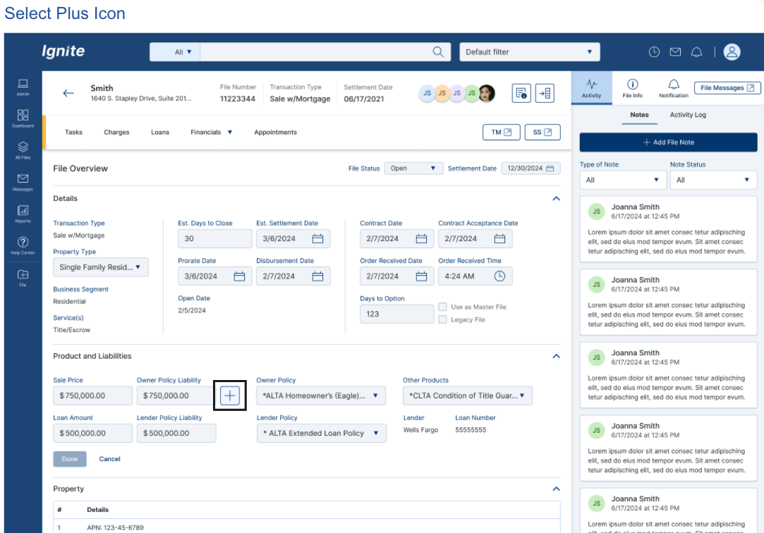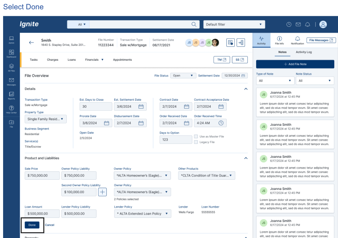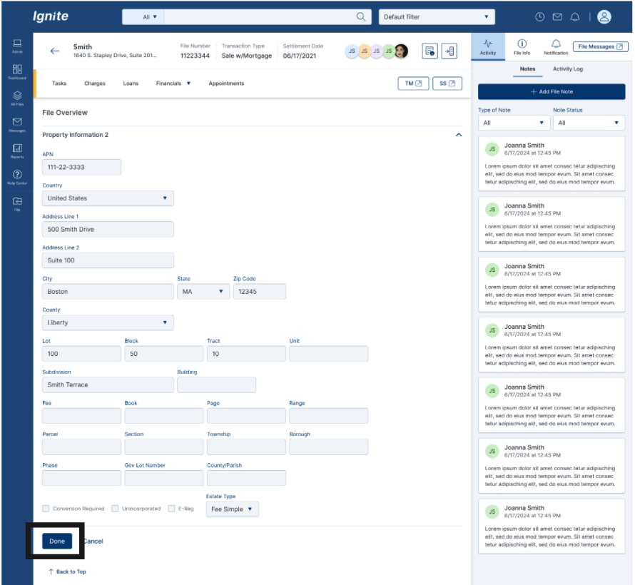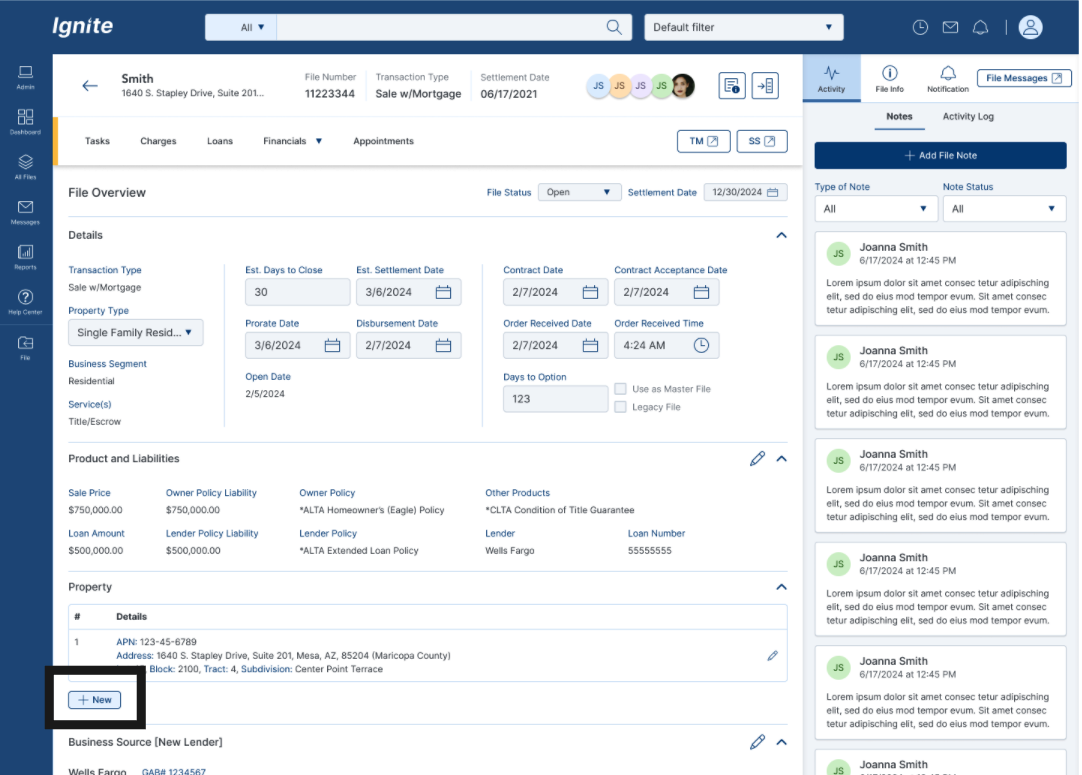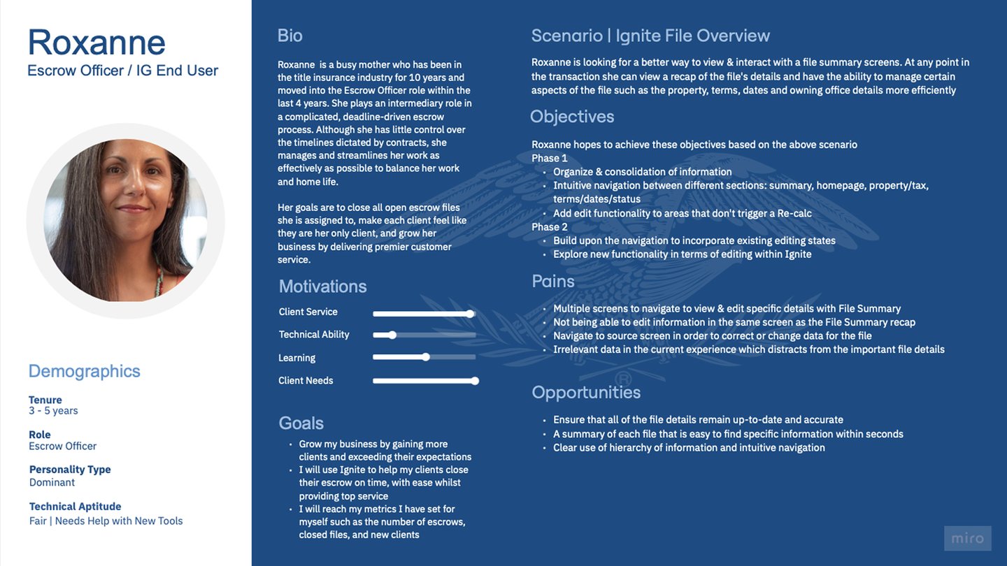 The File Overview screen provides quick access to key file details, enabling escrow officers to manage information efficiently without navigating multiple screens after file creation. It will function as a standalone screen in the Escrow application, consolidating Terms/Dates and Status, Property Tax information, File Summary, and File Homepage from the legacy system into a single, unified view.