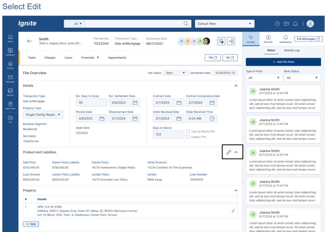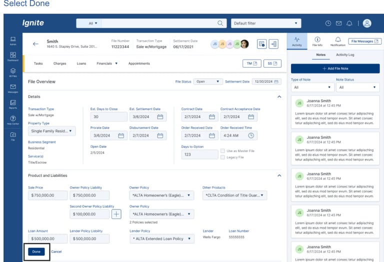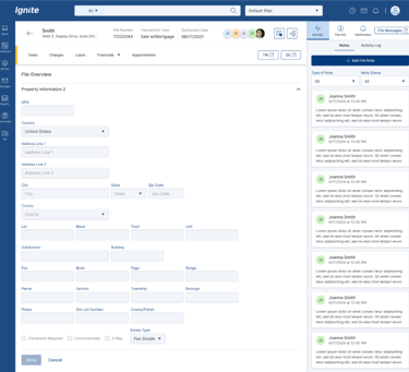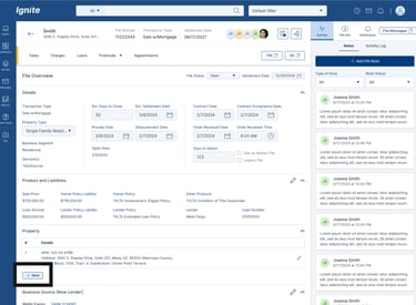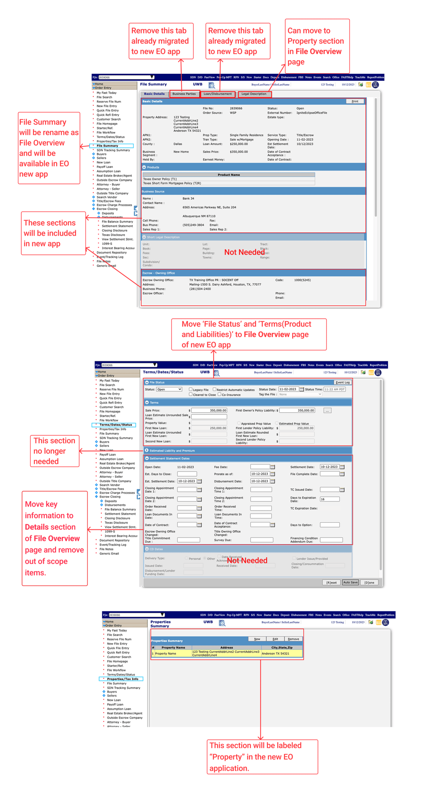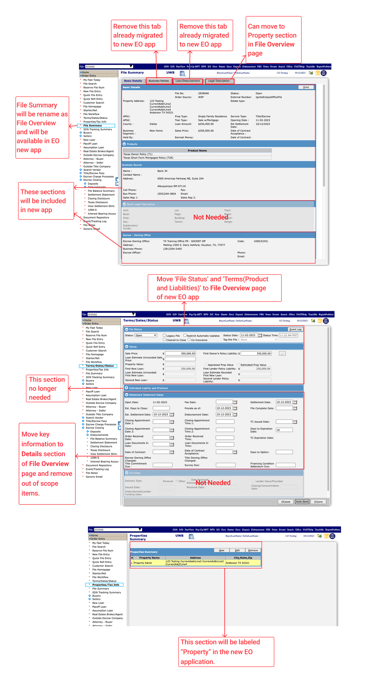 Escrow Officers (EO) need a screen that shows relevant file information together and also allows the ability to manage certain aspects of the file like the property, terms, settlement dates and owning office details more efficiently. This would reduce confusion by eliminating multiple source screens, redundancy of fields in each of the screens and inefficiencies allowing users to view and edit relevant file summary data in one place.