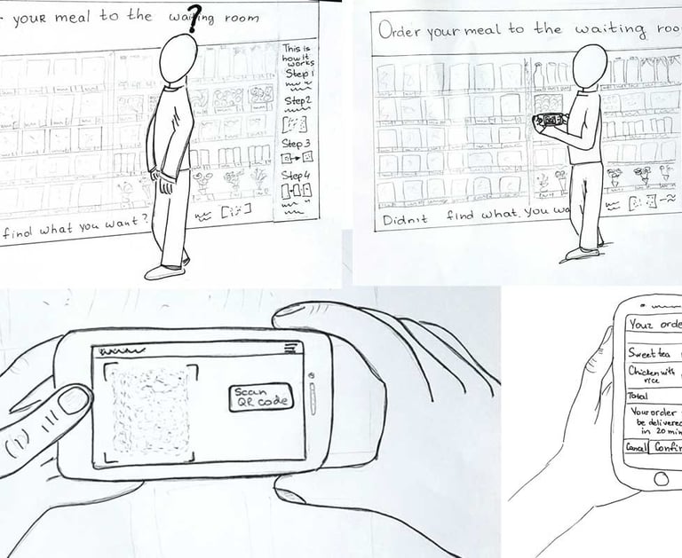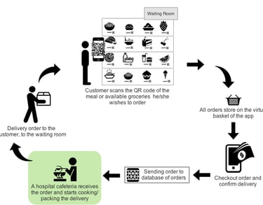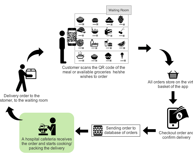 Users scan items, place orders, and receive delivery directly in the waiting room via hospital cafeteria staff.