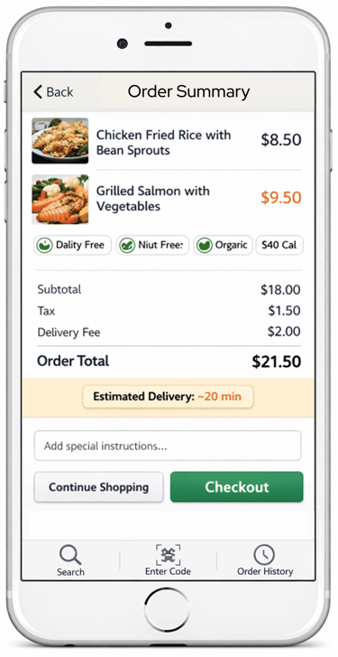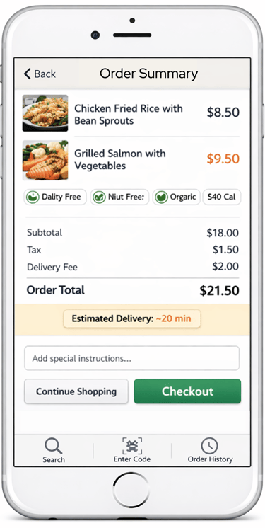 User scans QR code of desired meal or grocery item