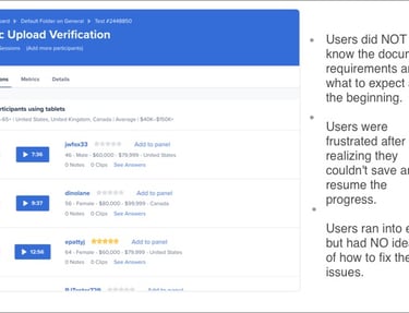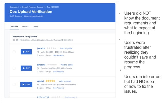 Taking the online verification experience as an example. By doing user testing and interviews (via usertesting.com), I discovered several major issues that could potentially cause the drop-offs.