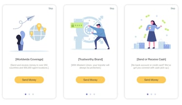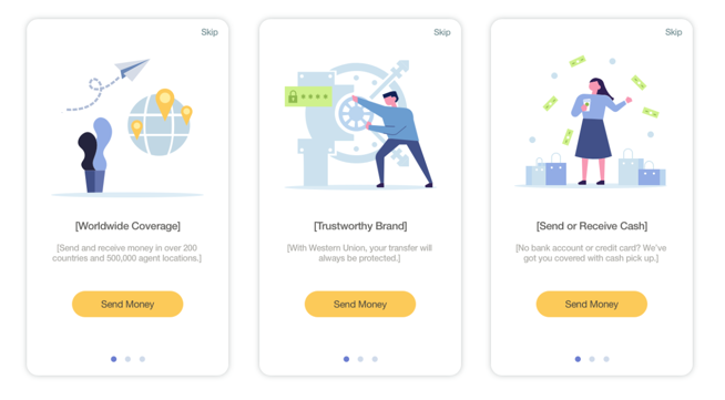 Throughout 2018, Western Union has been working on improving customer experience and attracting new customers. As a continuation of the efforts, the team proposed to inject a welcome experience (not existed before) to Western Union's mobile app. The goal is to present the value proposition and get people engaged to use the product.