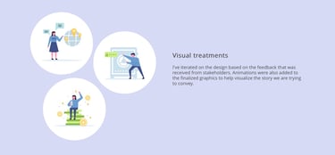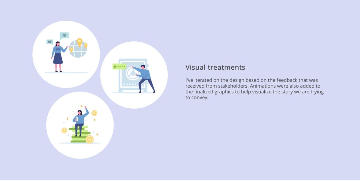 The entire project (from initial pitch to final release) took about 6 months. That is because of the lengthy and complicated approval process of the company. The team experienced a lot of back and forths with the legal and compliance department in terms of content approval. The team also encountered technical difficulties with implementation. We originally planned to import the animation (in SVG format) directly into the code. However, the engineering team realized that the codebase is not compatible with SVG files during the process. That caused the delay of the production as engineering had to hardcode the animation at the end. Overall, it was great teamwork and collaboration. We received positive feedback and compliment from our users and stakeholders.