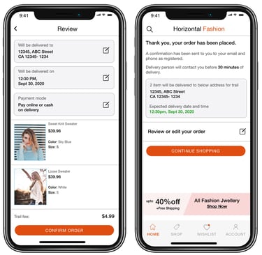 In case the customer chooses to buy a product (let’s assume the selling price is $30), the trial fee is waived off and adjusted in the cost of the product. The customer can then pay the changed amount ($28) online on the app or via cash to the delivery guy. The rejected items will return to the delivery guy.